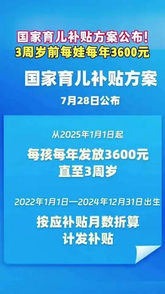 这个是2025年1月1日开始,对于三周岁以下的婴幼儿发放补贴,每个孩子每年是3600块钱,一直到孩子三岁,也就是如果你的孩子是在2025年1月份之后出生的,那么就可以领国家的1万多块钱。