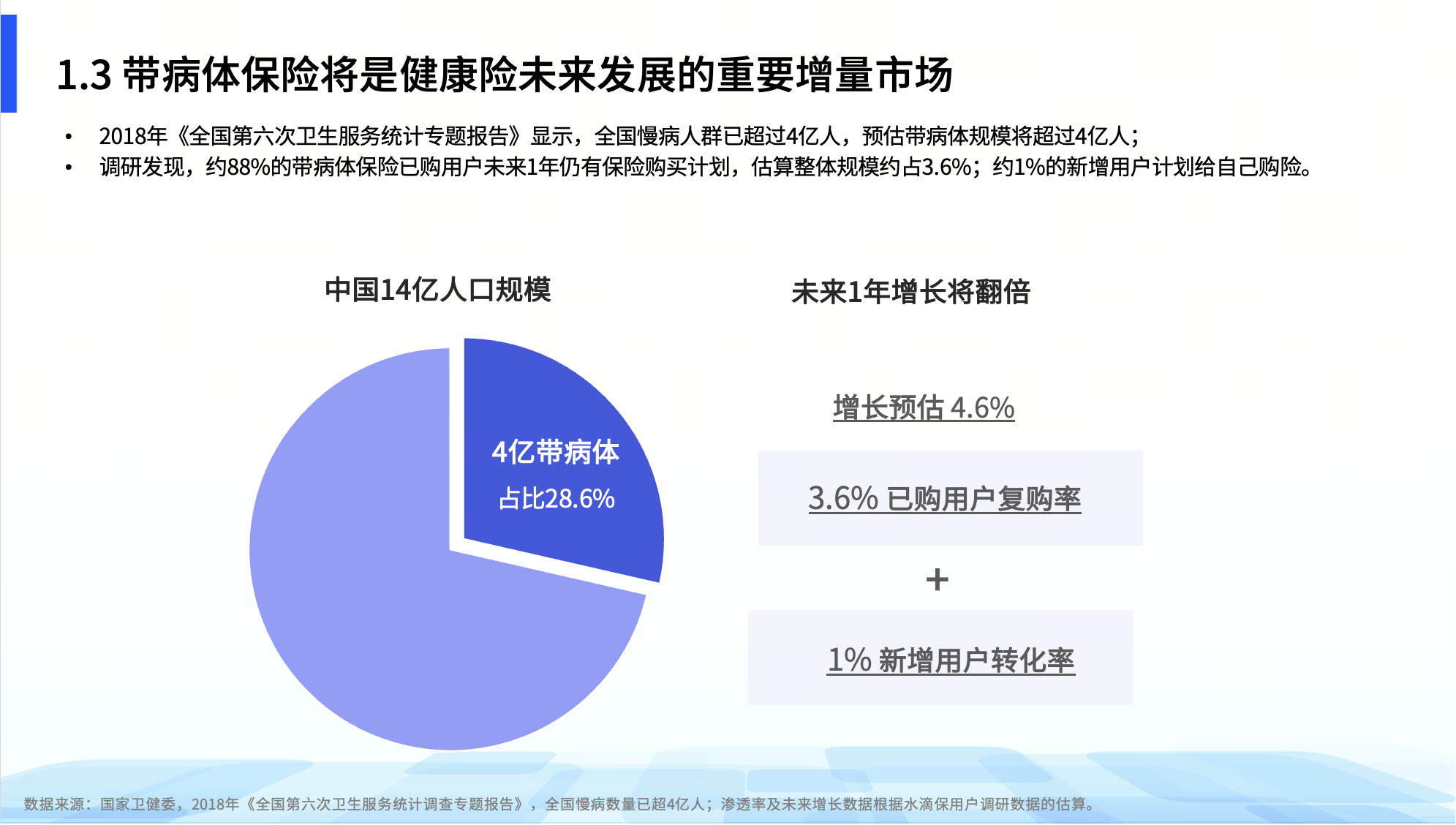 近年来,健康险行业出现供需不匹配现象,从“保健康人”到“保人健康”,不仅是行业未来的转型方向,也承载了4亿余带病人群的保障期待。用户需要怎样的带病体保险产品?带病体保险的创新困境与发展方向如何?经调查研究,近日《中国银行保险报》、中国社科院保险与经济发展研究中心、水滴保联合发布《带病体保险创新研究报告》(以下简称《报告》)。《报告》数据显示,约3个职场人中即有1人检出甲状腺结节,重症患者治疗费用年均约21万元,带病体保险是健康险重要增量市场,未来1年用户或将翻倍。