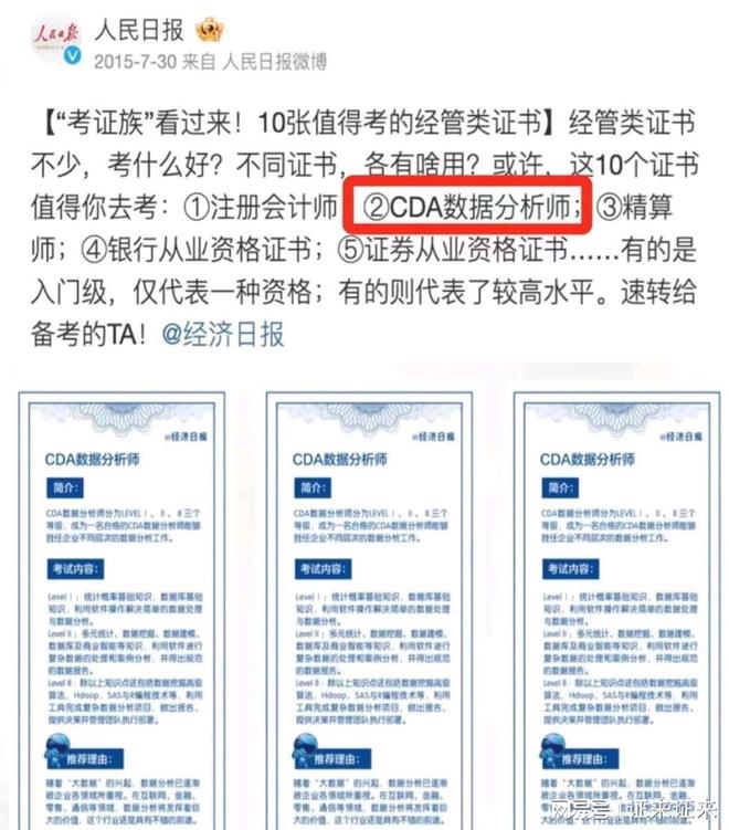 CDA数据分析师是数据领域认可度最高的证书,与CPA注会、CFA特许金融师齐名。受到了人民日报、经济日报等权威媒体推荐。