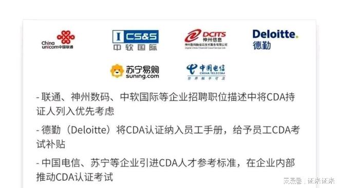 CDA企业认可度非常高,很多企业招聘时注明CDA数据分析师优先,对找工作非常有帮助。很多银行、金融机构的技术岗会要求必须是CDA数据分析师二级以上的持证人。中国联通、央视广信、德勤、苏宁等企业,把CDA持证人列入优先考虑或者对员工的CDA考试给补贴。