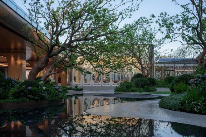 宽敞的草坪、弯曲的小径以及自然分布的树丛和灌木共同构成了一种宁静而舒适的空间。