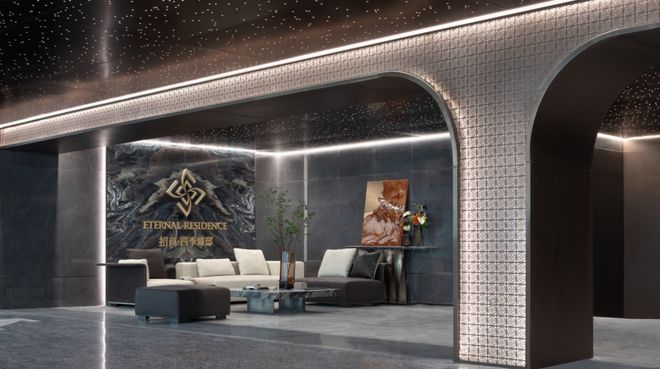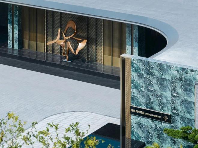 ,并且还是大尺寸整石铺设;门庭顶部还有约300个精致筒灯光束塑造的星空顶;以及仿铜金属质感的专属于项目的“四季之臻”雕塑,尺度、审美、工艺、辨识度全部拉满。